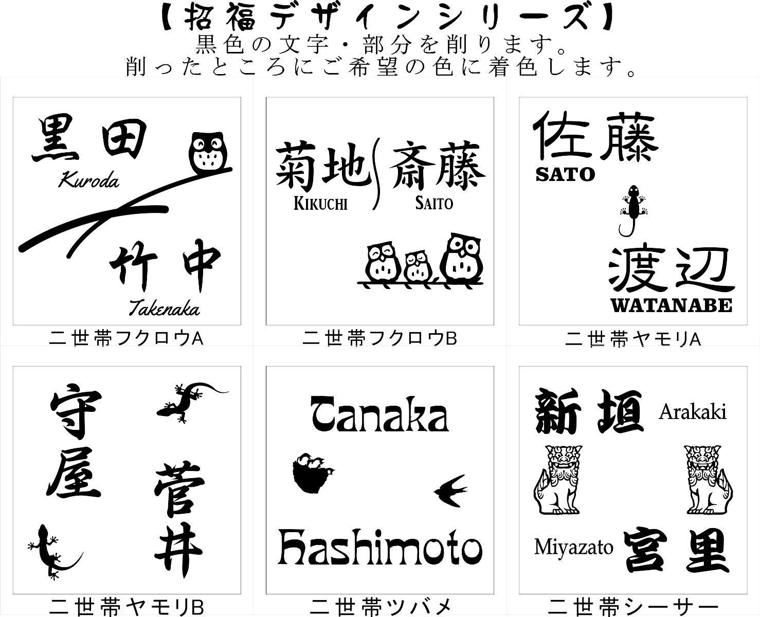 招福イラストデザインを追加しました 梟(フクロウ)、ヤモリ(家守り)、雀(スズメ)と竹、燕(ツバメ)、シーサー、四神(玄武、青龍、白虎、朱雀) 【New】二世帯フクロウ、二世帯ヤモリ、二世帯ツバメ、二世帯シーサー ※【追加マグネット】は有料オプションとなります。