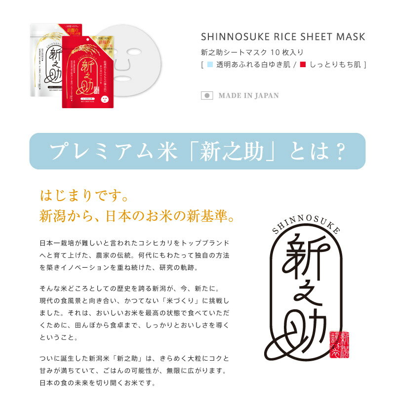 商品詳細 商品名新之助マスク10枚入 内容量10枚入り(165ml) 配合成分 ◆しっとりもち肌【赤】:水、イソペンチルジオール、グリセリン、ジグリセリン、コメエキス、コメヌカエキス、加水分解コメエキス、加水分解コメヌカエキス、スフィンゴ糖脂質、ヒアルロン酸Na、アセチルヒアルロン酸Na、水溶性コラーゲン、シロキクラゲ多糖体、ダイズ種子エキス、ハトムギ種子エキス、アロエベラ葉エキス、グリセリルグルコシド、ベタイン、イノシトール、ポリクオタニウム-51、キサンタンガム、(スチレン/VP)コポリマー、BG、フェノキシエタノール、ブチルカルバミン酸ヨウ化プロピニル、ヒドロキシプロピルシクロデキストリン、ソルビン酸、水添レシチン、水酸化Na、クエン酸、クエン酸Na ◆透明あふれる白ゆき肌【白】:水、イソペンチルジオール、グリセリン、ジグリセリン、コメエキス、コメヌカエキス、加水分解コメエキス、加水分解コメヌカエキス、アスコルビルグルコシド、アルブチン、アーチチョーク葉エキス、ヒメフウロエキス、オウゴン根エキス、カンゾウ根エキス、ナツメ果実エキス、イノシトール、グリセリルグルコシド、キサンタンガム、(スチレン/VP)コポリマー、BG、フェノキシエタノール、ソルビン酸、クエン酸、クエン酸Na ご使用上の注意事項 ●お肌に異常が生じていないかよく注意して使用してください。