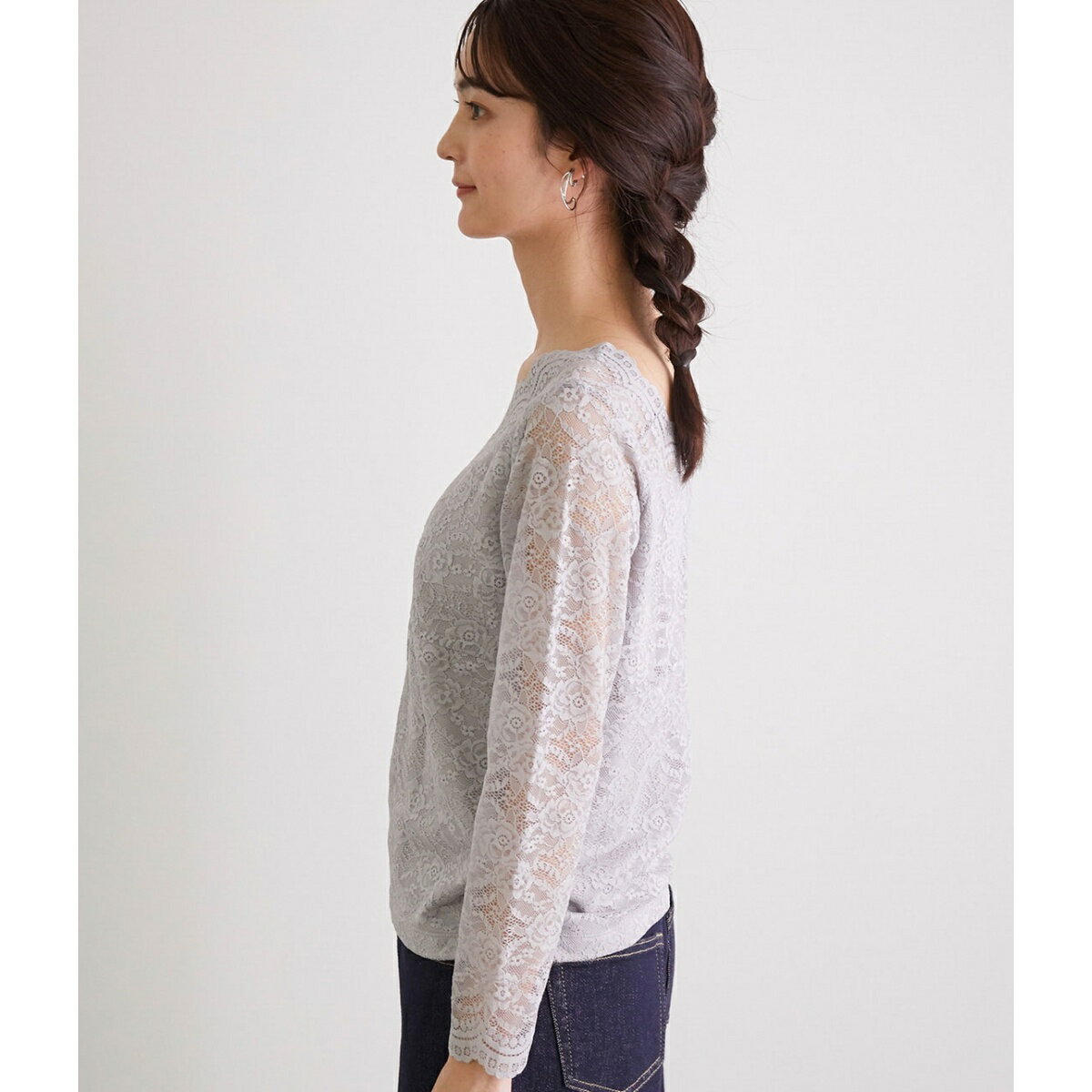 】アーモンドネックとVネックの前後2WAYで着用できる、総レースプルオーバーです。