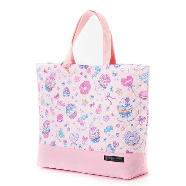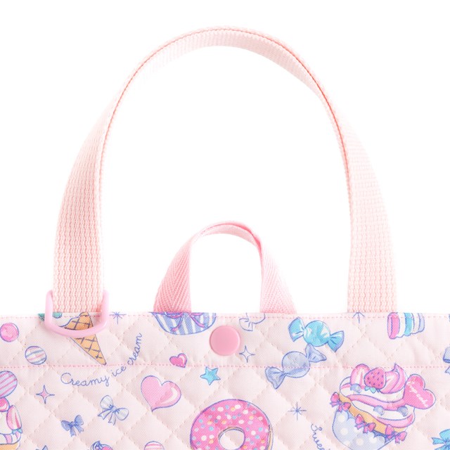 商品名マチ付きキルティングレッスンバッグ(ループ付き) ミルキースイーツのキャンディアラモード商品の特長1.お道具箱が収納できる、丈夫なマチ付きキルティングバッグ一般的な大きさのお道具箱(幅約23cm×奥行約33cm×高さ約6cm)が入るマチ付きバッグ。
