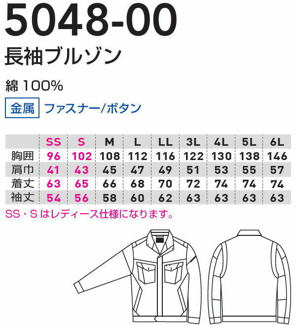 ■SS-LL/GS-G3L ■SS-S/W70-W88 ■M-LL/W70-W88 ■3L/W91-W100 ■4L/W105-W110 ■5L/W120 ■6L/W130機能説明 業界初!綿100% 防汚ストレッチ作業服に春夏モデルが登場! 国産生地を使用し、ひじ・ひざにバイアスカットを採用で圧倒的に動きやすい! ・信頼の日本製 生地を使用 ・肌触りが良く吸湿性のある綿100%素材 ・火を扱う現場にも対応した仕様 ・窮屈感を感じさせない適度なストレッチ性 ・汚れが付きにくく、落ちやすい防汚加工(クラボウ オフルージュ) ・ひじ・ひざのバイアスカット仕様で動きやすい ・ボタン・ファスナーが表に出ないスクラッチガード仕様 ・レディースサイズ対応商品 スペック メーカー 桑和(SOWA) 品番/シリーズ 5048-00 5048-09/5048シリーズ シーズン 春夏物 ※このシリーズの秋冬対応シリーズはコチラ 商品名 長袖ブルゾン&スラックスセット(上下同色) 素材 綿100% 機能 ストレッチ、優れた吸汗性、防汚加工、野帳ポケット(ブルゾン) 仕様 ブルゾン:SS・Sはレディースサイズになります。