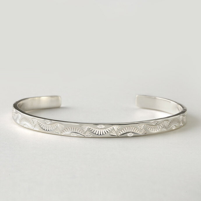 ▼FLUIハンドクラフトコレクション [Sunshine] 一覧▼ 商品詳細 説明模様の凹凸から生まれるシルバーの輝きが美しいバングル。